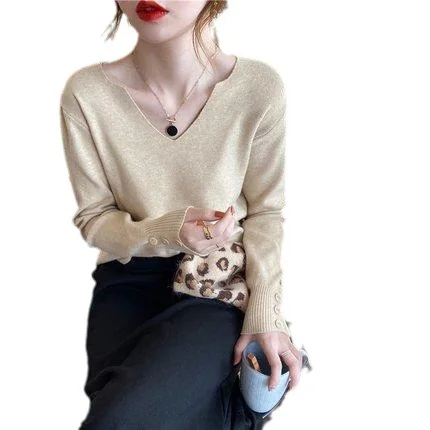 Autumn Fashion Women's V-Neck Loose Knitting Solid Color Printing Long-Sleeve Buttons Slim Lady's Pullover Knitwear Spring